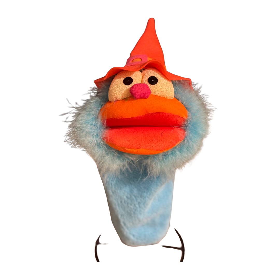 Handmade big-mouthed puppet with a light blue body, large orange mouth and blue fur collar. It wears a red witch's hat with decorative details. Perfect for acting out magical stories and entertaining children with its expressive design.