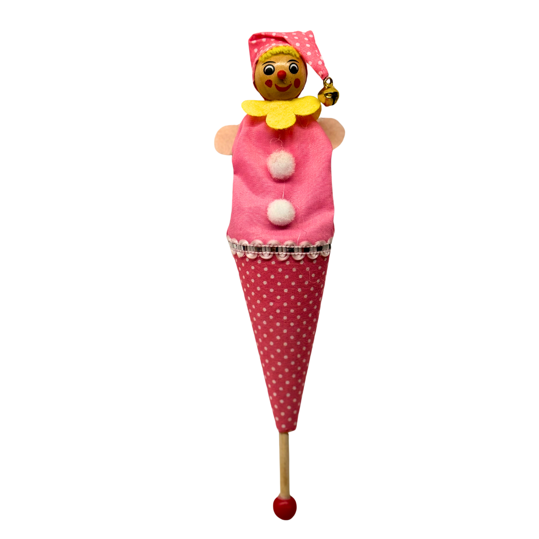 Handmade cone-shaped puppet with a pink body decorated with white dots, a yellow collar and two white pompoms. It wears a matching hat with a bell and a painted face with a cheerful expression. Ideal for puppet plays full of color and fun.